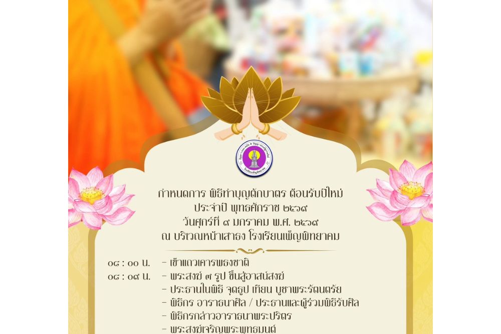 นางสาวประภัสสร ทามาลี ผู้อำนวยการโรงเรียนเพ็ญพิทยาคม พร้อมด้วยคณะผู้บริหาร คณะครู บุคลากรทางการศึกษา และนักเรียนโรงเรียนเพ็ญพิทยาคม จัด พิธีทำบุญตักบาตร ต้อนรับปีใหม่ ประจำปี พุทธศักราช 2569 เพื่อความเป็นสิริมงคลแก่คณะผู้บริหาร คณะครู บุคลากรทางการศึกษา และนักเรียน