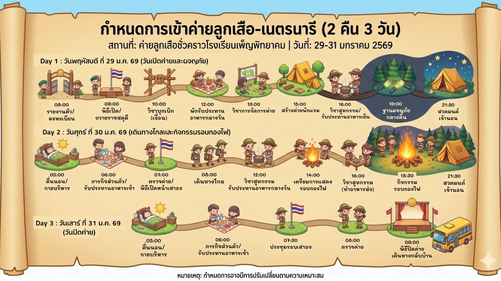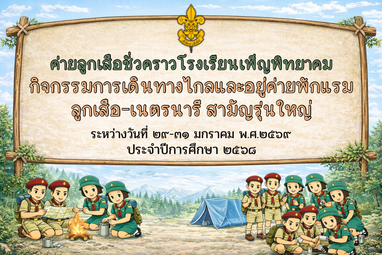 นางสาวประภัสสร ทามาลี ผู้อำนวยการโรงเรียนเพ็ญพิทยาคม พร้อมด้วยคณะผู้บริหาร คณะครู และบุคลากรทางการศึกษา ได้จัดกิจกรรมอยู่ค่ายพักแรมลูกเสือ–เนตรนารี ณ ค่ายลูกเสือชั่วคราวโรงเรียนเพ็ญพิทยาคม เพื่อส่งเสริมให้นักเรียนได้พัฒนาคุณลักษณะอันพึงประสงค์ตามหลักการลูกเสือ เสริมสร้างระเบียบวินัย ความสามัคคี ความอดทน และทักษะการดำรงชีวิตร่วมกัน กิจกรรมภายในค่ายประกอบด้วยพิธีบวงสรวง พิธีถวายราชสดุดีและเปิดกองลูกเสือ การฝึกทักษะบุกเบิก การจัดการค่ายพักแรม การสร้างค่ายพักแรม กิจกรรมสุขศึกษาและการประกอบอาหาร ตลอดจนกิจกรรมฐานผจญภัยยามกลางคืน ซึ่งได้รับความร่วมมือจากคณะผู้กำกับลูกเสือและคณะครูเป็นอย่างดียิ่ง การจัดกิจกรรมดังกล่าวนับเป็นการส่งเสริมการเรียนรู้จากประสบการณ์จริง ช่วยพัฒนาผู้เรียนให้มีความรับผิดชอบ มีภาวะผู้นำ มีจิตอาสา และสามารถนำความรู้และทักษะที่ได้รับไปปรับใช้ในชีวิตประจำวันได้อย่างเหมาะสม